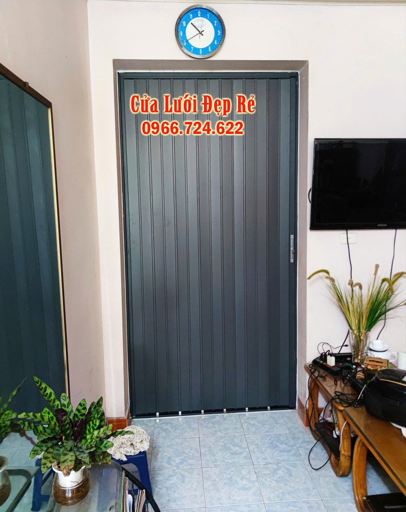 Lắp cửa xếp lá nhôm ghi ngăn lạnh cho cửa ra vào phòng ngủ và phòng khách nhà tập thể